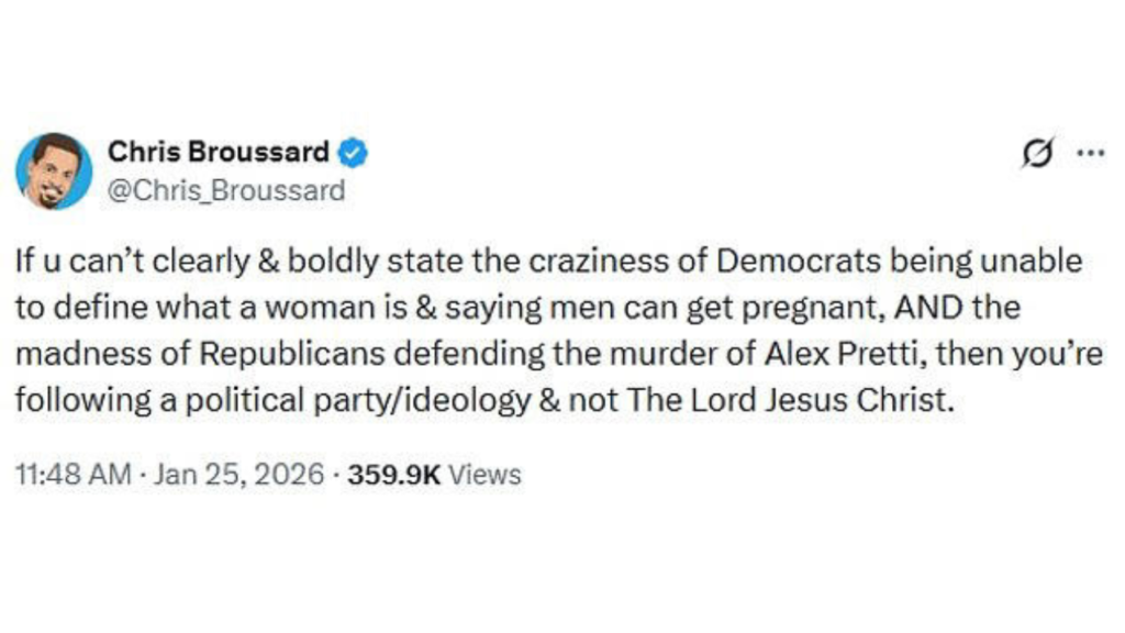 In a post shared Sunday, Broussard criticized both parties, writing that Democrats refusing to define gender and Republicans defending Pretti’s killing reflect loyalty to ideology over faith. The comment immediately split reactions online, with some praising his bluntness and others accusing him of drawing a “false equivalence” and missing the moment.