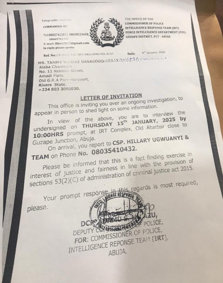 The invitation, dated January 9, demanded Danagogo’s presence on Thursday, January 15, at the IRT complex in Guzape, Abuja. While police described the summons as a “fact-finding exercise in the interest of justice and fairness,” the timing and political context suggest this is anything but neutral enforcement.